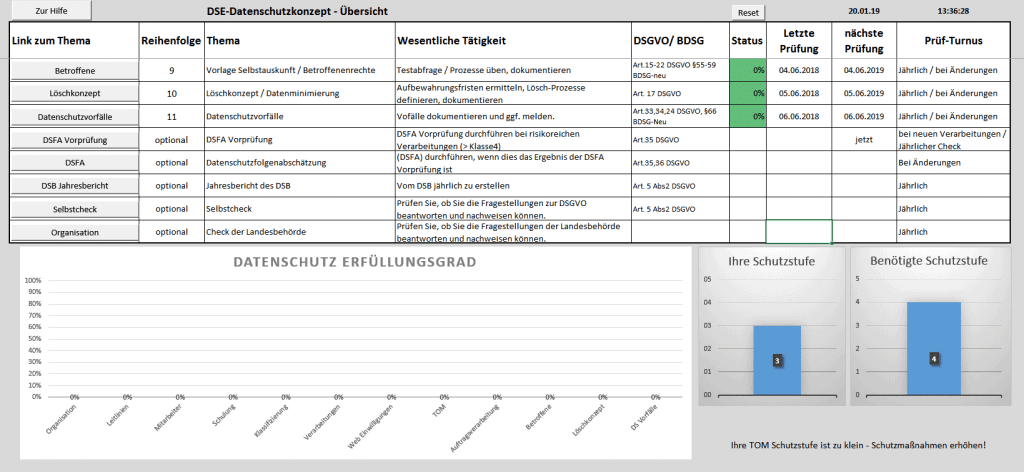 - Überblick über alle Datenschutzthemen und prozentualem Bearbeitungsstand