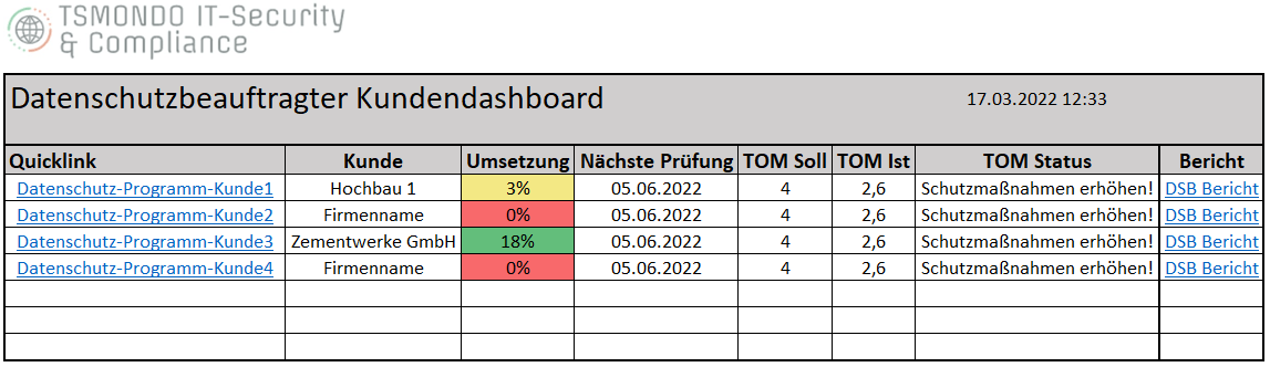 "Hallo Herr Schmidt, vor ein paar Tagen habe ich die Lizenz für die von Ihnen entwickelte Datenschutz-Software in der „Version für Datenschutzbeauftragte“ erworben. Ich finde das Programm sehr gut strukturiert und intuitiv aufgebaut. Die Einrichtung funktionierte problemlos. Mit seiner übersichtlichen Arbeitsblattstruktur bietet es einen guten organisatorischen Rahmen zur Unterstützung der Basisaufgaben eines externen DSB für kleine und mittlere Unternehmen. Zusammenfassend: ich finde es wirklich gut!"